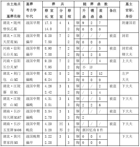 一般说来,在对战国时期楚贵族墓葬等级及墓主身份的判定中,除相关文字资料证据外,棺椁形制与用鼎礼制是两项不可或缺的依据。前者主要包括椁室面积、分室数量、棺椁重数等。后者主要包括正鼎数量、套数、陪鼎种类、仿礼器用量等。附表所列10墓的等级判定,多数为发掘整理者的意见[6] ,所作结论大都是以这两项作为主要依据,我们认为与实际出入可能不大。不过,由于被盗等原因,象藤店M1、望山M2、仰天湖M167、五里牌M406已无法对墓主丧葬用鼎礼制作详实的考察。《包山楚墓》就根据“葬制多以三为节”,认为藤店M1及望山M2墓主身份约为“元士”[7] 。
