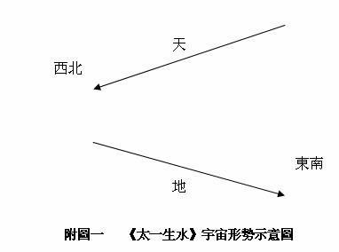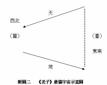 可知「橐籥」為冶鐵時所用的鼓風器,天地範圍的區域為皮囊,即「橐」;「籥」則是鼓風出入之所。「橐籥」呈「橐」寬大、「籥」細小的形狀,若以「籥」為西北,「橐」為東南,正合於《太一生水》的描述(附圖二)。[45]其以西北為「籥」,當為冬季時北風吹襲的形象譬喻,亦即「閶闔風」、「天氣」之所出。[46]